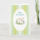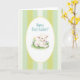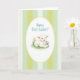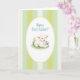 On the front of the card a sweet baby lamb with fluffy white wool lounges in a grassy patch, its wide dark eyes and rosy cheeks giving it a tender, friendly look 🐰. Small purple and yellow wildflowers sprinkle the grass around the lamb, adding gentle spring detail without crowding the scene 🌷. The main picture sits inside a tall oval frame with a pale yellow edge that draws your eye inward. Above the oval, the words “Happy first Easter!” appear centered near the top in teal lettering with a casual, handwritten look. Behind everything, the background is filled with alternating vertical stripes in pastel green and light mint. Thin dotted lines run along the stripes, creating a soft texture that feels calm and airy. The lamb’s relaxed pose and slight smile suggest a quiet closeness, like a little moment shared with someone dear. The oval border is a light buttery yellow, and the mint-and-green stripes extend to the edges with fine dotted accents.