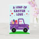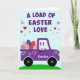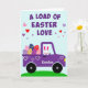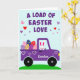 This card features a cartoon-style scene with a purple pickup truck carrying a heaping load of decorated oval eggs in the back, dotted and speckled in pink, blue, red, gold, and lavender 🌷. In the driver’s seat, a small white bunny with long ears and rosy cheeks leans toward the window as if sharing a sweet glance with the viewer 🐰. The background is light blue and sprinkled with tiny hearts in a few different shades, adding a gentle, affectionate touch to the open space. Across the top, the phrase “A LOAD OF EASTER LOVE” appears in large purple letters, centered and easy to read. On the side panel of the truck, the word “Grandson” is written in a flowing purple style that looks like it was brushed on. Near the bottom, a curved strip of green suggests a simple grassy hill beneath the truck. The eggs sit high above the truck bed, with their patterns and colors clearly visible against the sky-blue backdrop.