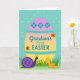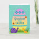 This card features an oversized oval spring egg centered on a soft aquamarine background, with a gentle gradient that shifts from lavender-pink at the top through peach to sunny yellow at the bottom 🌷. Decorative bands wrap the upper area with teal diamond shapes holding light blue flower icons, plus a zigzag stripe and a trail of tiny dots for extra detail. Across the middle, milestone wording is placed in flowing, cursive-style lettering in mixed shades of cheerful blue, with small coral flower accents tucked around the letters. Along the bottom edge of the egg, a patch of stylized emerald-green grass frames two cute, snail-like characters who face each other with a tender, friendly focus 🐇. The larger one on the left is deep purple with a neatly coiled shell and slim antennae, angled toward its companion as if sharing a quiet moment. The smaller one on the right is bright yellow with a coral spiral on its back and a little tuft on its head, turned toward the larger figure in gentle curiosity. Behind them, the aquamarine field is sprinkled with soft, pale circular specks that look like faint bubbles or glowing dots.