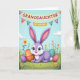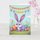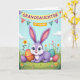 This card features a soft digital illustration of a lavender-furred bunny with pink-lined ears, gazing forward with big blue eyes and a gentle smile that feels like a quiet hello 🐰. The bunny reclines on a grassy green hill among patterned oval eggs decorated with stripes and grid-like lines in orange, purple, teal, and red, arranged close together like they’re sharing the space. Small wildflowers in pale yellow, blush pink, and light blue dot the slope, adding a springtime setting that looks like it’s meant for lingering. Above, a clear blue sky holds a few fluffy white clouds, keeping the scene airy and bright. Near the top, a banner of triangular pennants shows plaid patterns in red, teal, and purple, creating a cozy, togetherness mood 🌷. Two golden rectangular panels sit within the banner, with “GRANDDAUGHTER” and “1ST EASTER” in clear lettering placed prominently across the upper area. Soft, even lighting smooths the textures and keeps the colors gentle, especially around the bunny’s face and the egg patterns. The banner stretches across the top edge with the gold text panels centered between the plaid pennants.