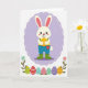 This design shows a cute, human-like white rabbit 🐰 with shiny black eyes and rosy cheeks, centered inside a large soft-lavender oval with a gently scalloped edge. The rabbit wears a sunny yellow shirt under teal overalls with a small red pocket, finished with deep green boots, and its paws hold a glowing orange egg close like a little gift for someone special. The plain white background keeps the focus on the rabbit’s tender, careful pose, like it’s presenting the egg to a friend. Near the bottom, a neat row of six decorated eggs stretches across in assorted patterns such as polka dots, stripes, zigzags, and star shapes. The eggs mix rich colors like red, aqua, green, gold, and purple, creating a cheerful rhythm across the page. Slender green stems with tiny blossoms in soft blue and pink weave between the eggs 🌷, adding a garden touch. The greeting text sits above the egg row in a simple, medium-size lavender font, centered beneath the oval frame. The lavender oval has a scalloped outline, and the six patterned eggs line up in a straight band along the lower portion of the card.