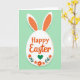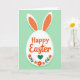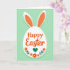 This design shows an egg-shaped white figure with tall pointed ears centered on a pastel mint green background, suggesting a friendly spring bunny 🐰. The layout feels balanced and tidy, with the white oval acting like a spotlight that draws your eye in. Across the middle, a festive greeting sits in rounded orange lettering, centered and easy to read. Just above the words, two long leaf-like shapes in orange with white edging rise from the top of the oval like perky ears, giving the character an eager, affectionate presence. Beneath the text, a small floral arrangement spreads outward with five-petal orange blossoms and simple green leaves, like a bouquet offered between close friends 🌷. At the center of that arrangement rests a deep emerald green heart, tucked among the foliage as a quiet sign of closeness. The overall look stays flat and graphic, with smooth areas of color and crisp edges that keep everything clear. Two orange ear shapes with white borders extend upward from the top of the white oval against the mint green field.