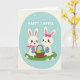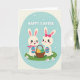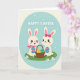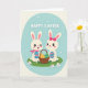 This design shows two upright bunnies 🐰 standing close together on a green oval patch, gently framing a woven basket filled with decorated eggs. One bunny wears a soft pink neck ribbon while the other has a matching bow near one ear, and their wide dark eyes and rosy cheeks give them a tender, friendly look toward each other. The scene sits inside a light blue oval window against a creamy background, creating a cozy, contained setting. Small white flowers and scattered pale dots float across the blue area, adding a light springtime feel 🌷. Several eggs spill from the basket and into their paws, painted with blue and pink stripes, yellow with bright pink polka dots, and a green egg with tiny speckles. Above the illustration, rounded white lettering is placed near the top of the blue oval to display the Easter greeting. The basket’s tan weave lines curve around the eggs, with a few tiny white blossoms tucked near the grass at the base.