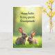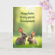 Designed with two young rabbits nestled low in a lush patch of spring grass, the scene highlights their soft reddish-brown fur against rich green blades 🐰. Their wide, glossy eyes seem to meet with a gentle curiosity, and the slight tilt of their heads suggests a quiet closeness like close friends sharing a secret. Warm light catches the edges of their ears, giving them a faint glow that adds to the tender mood without needing any extra fuss. Above the pair, a flowing holiday message sits near the top center in a light-toned lettering that stands out against the bright background. The backdrop fades into a golden-green blur with round, out-of-focus light spots, like morning sun filtering through leaves 🌷. Near the lower right, an oval egg-shaped object in a strong pinkish tone peeks out from the grass. The rabbits remain at the base of the frame, surrounded by tall grass tips and soft bokeh circles behind them.