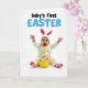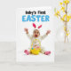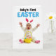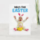 This card shows a joyful baby in a studio-style portrait against a white background, wearing a creamy hooded romper with upright bunny ears lined in pink 🐰. The baby’s open-mouthed laugh, sparkling eyes, and lifted arms create a sweet, friendly energy, like they’re reaching toward someone just off camera. To the side sits a yellow basket filled with pastel oval treats in soft blue, yellow, green, and pink, adding a gentle spring touch 🌷. The baby’s bright pink feet stand out as a cute pop of color against the pale outfit and backdrop. Soft, even lighting brings out the fabric’s cozy texture and keeps the scene airy and light. The text “Baby’s First” appears above the larger word “EASTER,” set in a strong, easy-to-read type in dark lettering near the upper portion of the design. The overall layout keeps the baby centered while the basket rests nearby, with the pastel treats peeking over the rim.