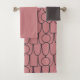 This towel set has an art deco design of pink ovals, rectangles, and circles in gray horizontal lines repeating in rows.