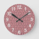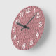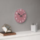 This wall clock has an art deco design of pink ovals, rectangles, and circles in gray horizontal lines repeating in rows.