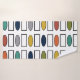 This towel set has a bath towel with a mid-century modern design of repeating rectangles and ovals in retro colors, a turquoise washcloth, and a yellow hand towel.