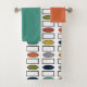 This towel set has a bath towel with a mid-century modern design of repeating rectangles and ovals in retro colors, an orange washcloth, and a turquoise hand towel.
