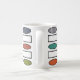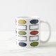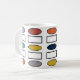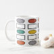 This mug has a mid-century modern design of repeating rectangles and ovals in retro colors.