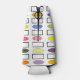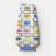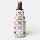 This bottle cooler has a mid-century modern design of repeating rectangles and ovals in flower garden colors.
