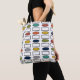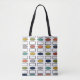 This tote bag has a mid-century modern design of repeating rectangles and ovals in retro colors.