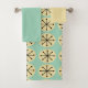 This towel set has a bath towel with a mid-century modern design of cream ovals and black starbursts on a field of sea green, a yellow washcloth, and a sea green hand towel.