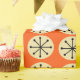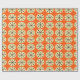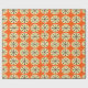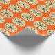 This wrapping paper has a mid-century modern design of cream ovals and black starbursts on a field of orange.