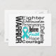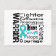 Ovarian Cancer Warrior awareness t-shirts, merchandise & gifts featuring a collage describing the attributes of a cancer warrior. The design features text attributes of a warrior including the words Fighter, Determination, Perseverance, Believe, Faith, Hope, Defiant and Courage. This design is arranged in a cool distressed teal ribbon, collage text with mixed style fonts providing a unique flair to the design element.