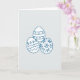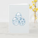 Designed with three egg-shaped forms outlined in deep blue, this card sits on a pale gray background and keeps the layout simple and focused. One egg rests gently on top of two, like close friends leaning in for a photo, creating a soft pyramid shape in the center. Each egg carries its own pattern, giving the trio a cozy, together-but-different look that feels a bit like friendship or romance in quiet harmony 🐰. The top egg is filled with tidy horizontal stripes and rows of small open circles, adding a calm, orderly rhythm. The lower-left egg features sharp zigzags and a row of small four-point star shapes near the top, bringing a light, celebratory touch 🌷. The lower-right egg centers on a flower-like burst, with short jagged strokes spreading outward like an abstract bloom. A short Easter greeting in dark blue appears above the stacked eggs, centered near the top edge, with a smaller line of text placed below the trio.