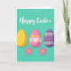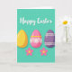 This design shows a spring-themed illustration on a soft teal background with a light scatter of pale speckles, giving the scene a gentle texture 🌷. Across the middle sit three large egg-shaped forms, spaced evenly like friends lined up for a photo. The left egg is a warm golden yellow with no extra markings, while the center egg is pink with white lace-like detailing, small heart shapes, and a thin yellow band that adds a sweet, affectionate touch. The right egg is purple with neat horizontal white stripes, balancing the group with a calm, steady look. Near the top, the words “Happy Easter” appear in flowing white lettering, centered and standing out clearly against the cool background 🐰. Beneath the eggs, two matching pink flowers with five rounded petals and sunny yellow centers sit side by side, echoing each other like a quiet pair. The flowers are placed near the lower area under the middle egg, with their petals in soft pink and their circular centers in bright yellow.