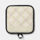 This pot holder features a gingham style picnic plaid in pale light green and mauve pink with a solid pale green strip across the top for a centered personalized name in a hand-written style font.