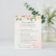 This baby shower game card features beautiful soft pastel watercolor roses and peonies in shades of blush pink and peach with lush green botanical leaves and eucalyptus.