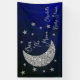 Over the moon baby shower with silver moon and stars against a black and blue night sky background