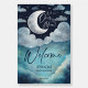 We are Over the moon sky clouds galaxy baby shower editable template welcome sign board, watercolor cyan blue galaxy clouds silver moon and stars baby shower entrance decor