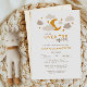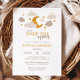 Over the moon baby shower invitations with a whimsical celestial theme create a charming way to celebrate a new arrival. This gender-neutral design features a golden crescent moon surrounded by soft beige and taupe clouds, accented with golden stars for a dreamy, night-sky atmosphere. The modern typography includes a playful mix of bold serif and handwritten script fonts, making the wording stand out with stylish elegance. Perfect for a baby shower with a soft, neutral palette, this design balances sophistication with a cozy, welcoming vibe that appeals to parents seeking a modern yet heartfelt invitation style. Available as printed cards or an instant digital download.