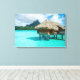 Canvas landscape print of an over-water thatched roof honeymoon bungalow in a resort in the clear turquoise lagoon of the tropical island Bora Bora with view on Mt. Otemanu near Tahiti in French Polynesia.