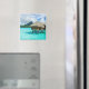 Souvenir photo magnet of an over-water thatched roof honeymoon bungalow in a resort in the clear turquoise lagoon of the tropical island Bora Bora with view on Mt. Otemanu near Tahiti in French Polynesia with the tekst: 'Bora Bora'.