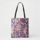 Beachy summery tote bag with a design of overlapping corals in dark purple, red, and peach.