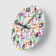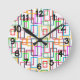 This wall clock has a Bauhaus design of overlapping rectangles in various colors.