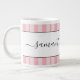 Extra large personalized coffee mug with a cute pink bird and stripe pattern.