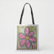 One large oversized flower adorns this tote bag with whimsical pink petals and gold center, a mixed media work of art. A carry-all that can be enjoyed with each use any day of the week.