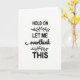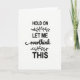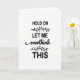 This card features a simple black-and-white design with a funny, relatable message at the center. The text reads “HOLD ON LET ME overthink THIS,” laid out in four parts across the middle of the front. “HOLD ON” and “LET ME” appear at the top in all-caps, thick sans-serif letters, and “THIS” sits below in the same strong style. The word “overthink” is written in a flowing cursive style, making it stand out as the main focus. On each side of “overthink,” there’s a small black leafy branch that frames the word like a gentle hug. The plain white background keeps everything easy to read and gives the card a calm, modern look. It’s a sweet way to say “I get you” to someone you care about, with a little humor mixed in 💘❤️.