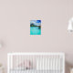 Vertical poster print of a honeymoon overwater bungalow resort in the turquoise blue lagoon of the pacific island of Bora Bora, near Tahiti in French Polynesia.