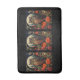 A bath mat with a cool looking owl with a piercing stare. A full moon in the back with a garden of red flowers.