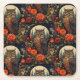 A paper coaster (sturdy pulp board) with a cool looking owl with a piercing stare. A full moon in the back with a garden of red flowers.