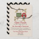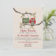 A back to school classroom open house invitation featuring an illustration of a red owl with a black and white chevron belly sitting on a tree branch with chalkboard. Personalize the text. Opposite side is black chevron.