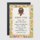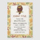 Cartoon illustration of owl sitting on tree branch under beige seamless background with leaves.