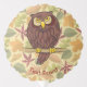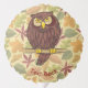 Cartoon illustration of owl sitting on tree branch under beige seamless background with leaves.