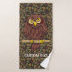 Cartoon illustration of owl sitting on tree branch on dark background. Custom text.