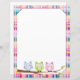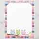 Owl Plaid bordered writing paper. Features three fun pink, green & blue owls with a colored plaid design border. Back displays one blue owl in middle of page.