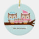Customizable Christmas ornaments featuring an adorable family of owls perched on a tree branch in soft pastel colors.