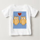 design of two owls standing together with a red love heart between them on a sky blue background. Cute and quirky cartoon design inspired by love and friendship.