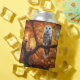 A stunning can cooler or cozy showcasing an owl encircled by glowing candles, nestled among autumn leaves, evoking a mystical and enchanting fantasy vibe.