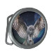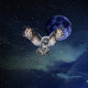 Amazing wildlife. The great grey owl or great gray owl is a very large owl, documented as the world's largest species of owl by length. Owl in flight, dark sky with stars and blue moon.