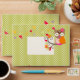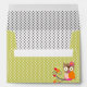 Brown owl with pink and orange feather on chartreuse background with mini dots. Background + font colors are customizable.
