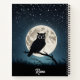 A black owl, speckled with white, is perched on a branch, silhouetted by a large, full moon on a star-filled night. Very beautiful image, perfect for anyone who loves owls and fantasy.