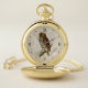 Nature inspired pocket watch, with graphic art of an owl on a branch, against a light wood looking background. Personalize the name to suit your needs. Great gift idea for any bird lover.