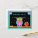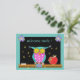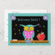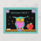 A cute and cheerful postcard to welcome kindergartners students to school . The front of the postcard has a pretty colorful owl standing ahead of a chalkboard and next to a red apple . On the top it says "Welcome back!" . On the back is a text template with all the information for the first day of school . Modify it to fit your needs . There is also a line to add the teacher name and the room number .