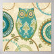 © Veronique Charron / Wild Apple. A patterned image of an owl with circular patterns. There is also a tan colored floral background in the image.